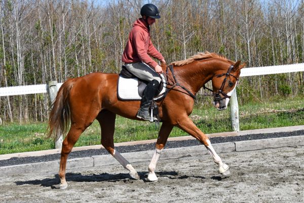It was a busy riding ring but yet he was just super chill about everything going on. He was happy to just stroll around quietly. Talk about one that is such a nice mover considering he is huge, raced a week ago and shipped 12hrs yesterday. If they move like this right now just give them a month of let down and watch out! Three super impressive gaits and that canter is so lovely. The rhythm on this guy is just lovely. He is already figuring out how to stretch and use his body. Just so darn smart. More of a horse that you can put your leg on but not one you need to kick on.
