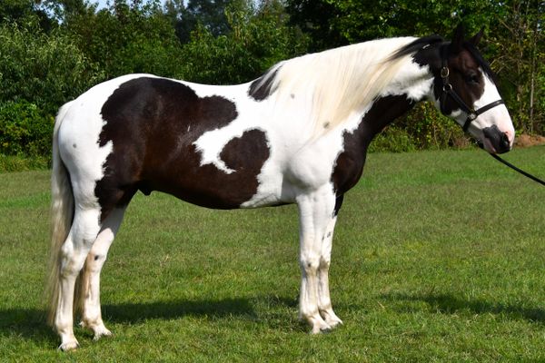 Gilbert is a 5yr 16.1 h thick built gypsy quarter horse cross gelding with a long flowing mane and the most gorgeous color. If you are looking for the size, color, beauty and brain, this one checks the boxes! Gilbert can do it all from English, western, trails, jumping, and so much more. It can be really hard to find that SAFE all around horse that you can hit the show ring with but also go fox hunting, trail riding, let your kids or husband ride, lend to friends, etc. He is the best friend type that loves everyone he meets and everyone loves him!