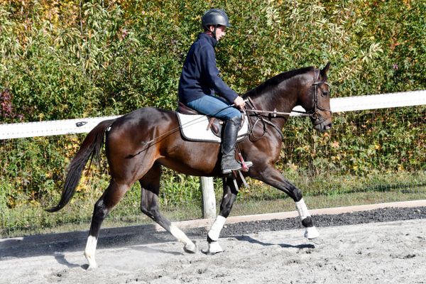 We had let him loose in the free area the other day and thought wow what a lovely mover but it honestly never does them justice. As nice as he moved out there, he was just way nicer under tack. Came right out just as relaxed as you could want a horse on the first ride. Stood quietly at the mounting block. Already stretching down over his back in all three gaits. Just a super nice nice mover with a lovely way of going. He is so balanced!